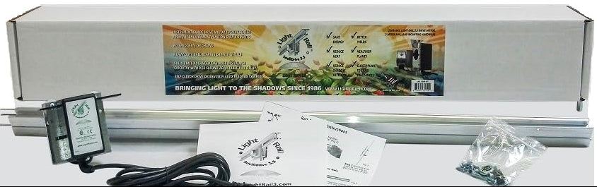 Much better yields when our grow lights move because more leaf area is reached with better light, so no hot spots and no shadow patterns. Plus we cover about 30 percent more area, and that’s per grow light. Travels approx. 4 feet per minute. 0 to 60 second adjustable time delay. Handles reflectors up to 50 pounds. Light Rail 3.5 works with 110 volt only and does not work with 220 volt electrical.