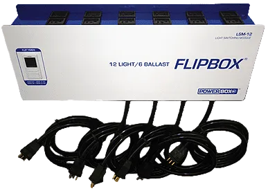 The original PowerBox FlipBox is an individual light switching module that allows an individual ballast to run two separate lights, one at a time, by switching back and forth between each light, at a user-specified interval. Timer not included for FlipBox 2. Designed and manufactured in California.